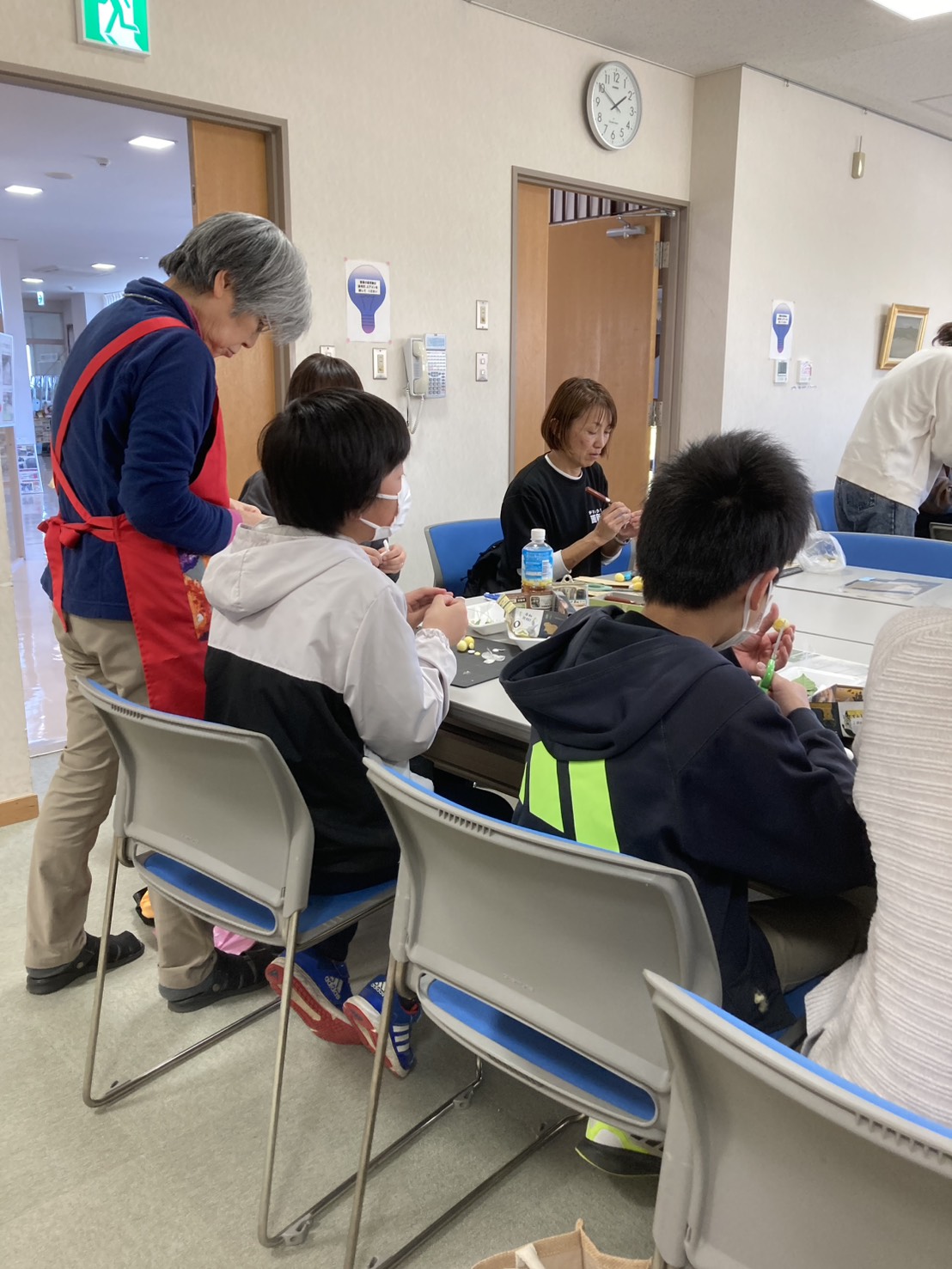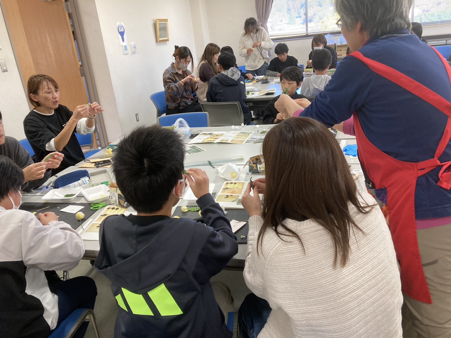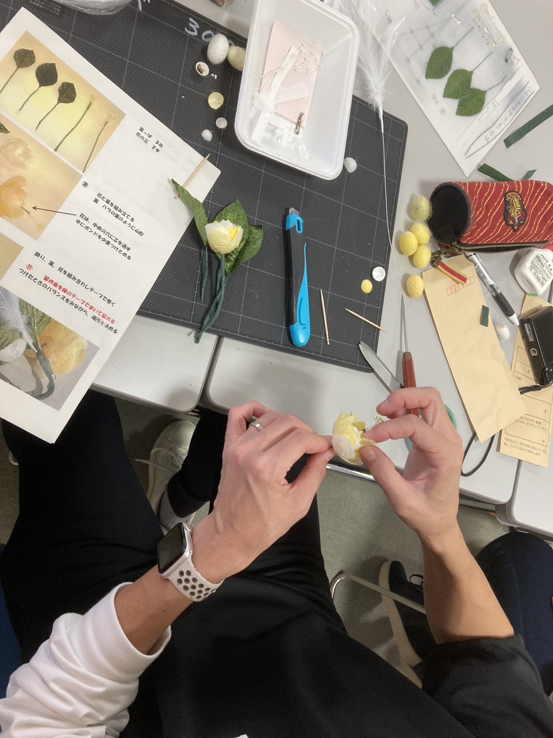 子どもたちは、かわらんべの指導員の方の説明を聞きながら、上手にカイコの繭を薄く剥いで黄色と白と組み合わせてステキなコサージュを完成させていました。